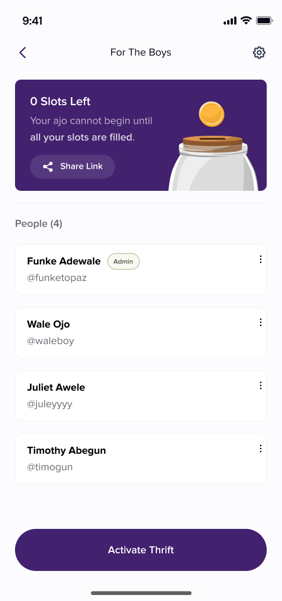 You’re all set! It’s time to add members to your thrift group. Click on the share icon at the top right of your thrift, copy the invite link and share with friends, family, or colleagues to join.