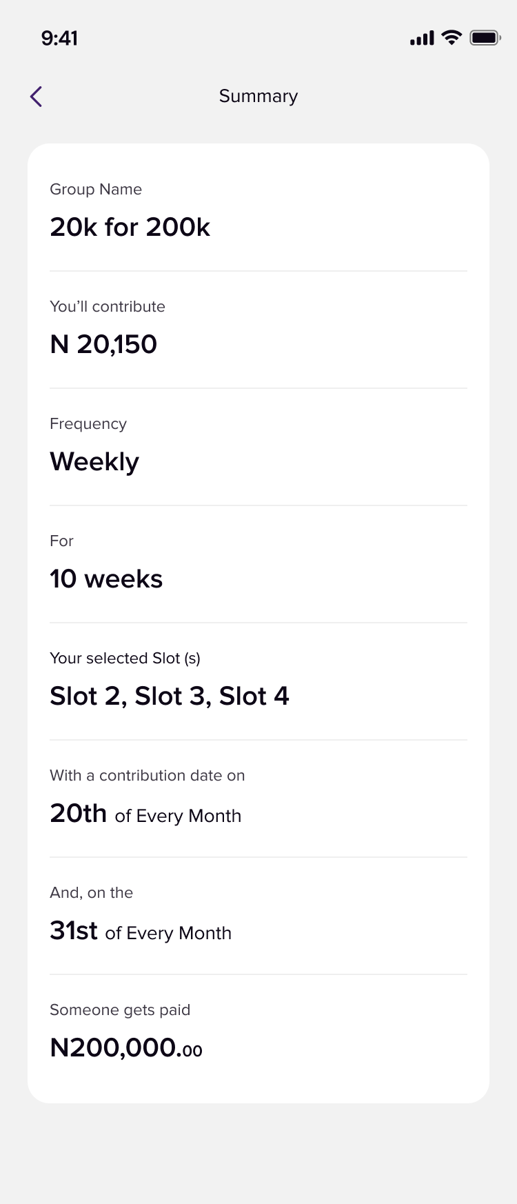 - The frequency of contributions (weekly or monthly).